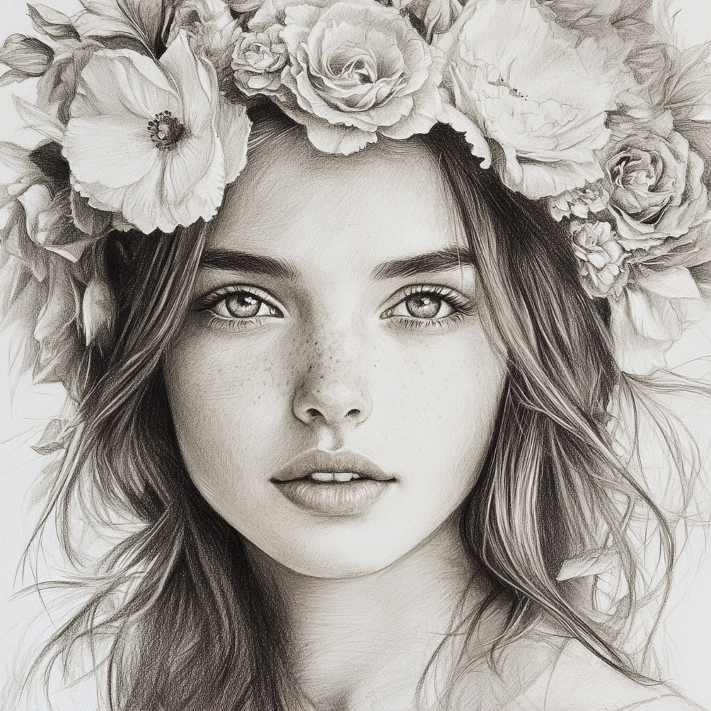 Capture timeless elegance with this pencil sketch–style prompt featuring graceful female portraits. Ideal for book illustrations, fine art prints, concept art, and editorial designs. This prompt creates hand-drawn-style images with delicate pencil lines, subtle shading, and floral headpieces that evoke beauty and sophistication. Perfect for artists and designers seeking a refined, vintage-inspired aesthetic with emotional depth.